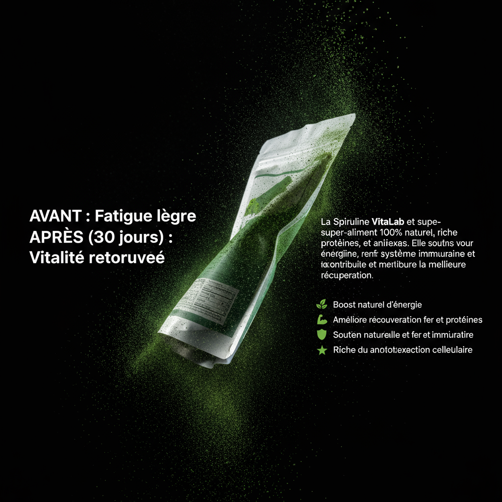 Avec Spiruline VitaLab, boostez votre vitalité naturellement et sentez la différence dès les premières prises. Simple, efficace, naturel."